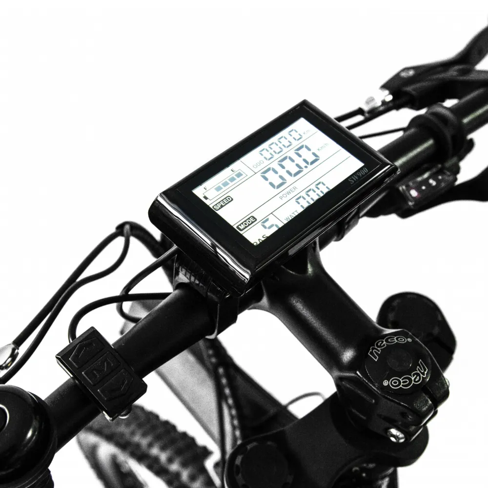 Основные показатели электровелосипеда можно контролировать благодаря установленному на руле LCD монитору. Подобрать под себя нужную скорость движения и уровень мощности можно, лишь нажав ручку газа. Также имеется дополнительная кнопка для механического переключения передач.
