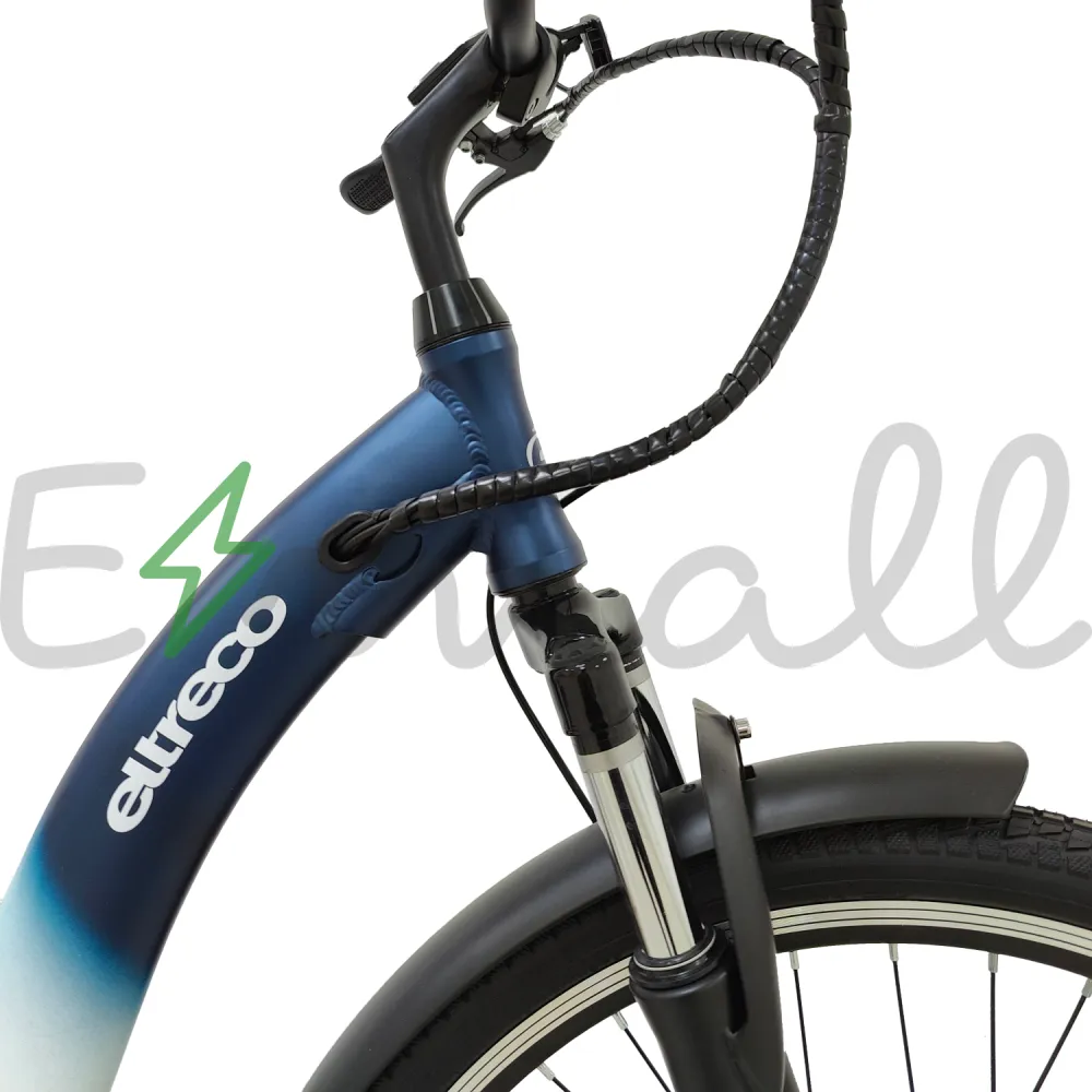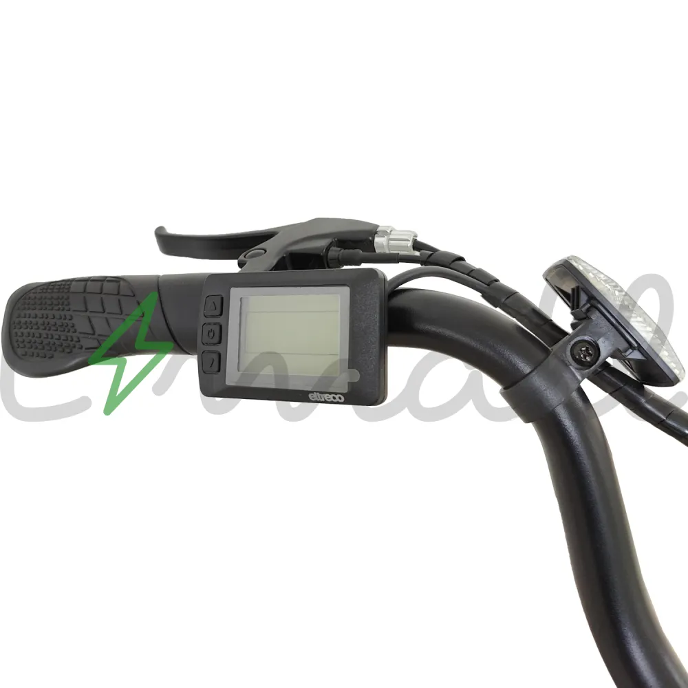 Рама изделия усовершенствована. Стала максимально легкой благодаря изящному алюминию. Рулевая часть велогибрида оснащена LCD-велокомпьютером Eltreco M3, благодаря которому удобно отслеживать скоростные характеристики, заряд АКБ и другие параметры.